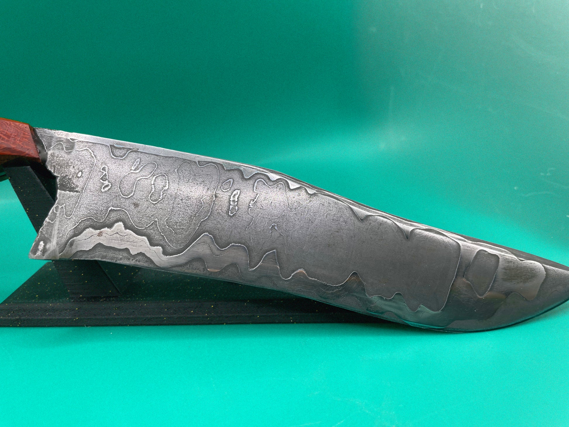This 8" Recurve Bowie features a striking layered design combining nickel and 1084 steel, delivering both durability and aesthetic appeal. The recurve blade geometry enhances cutting efficiency and control, making it ideal for expert users seeking precision and strength. Crafted for reliable performance, this knife balances robust construction with refined detail for demanding task.